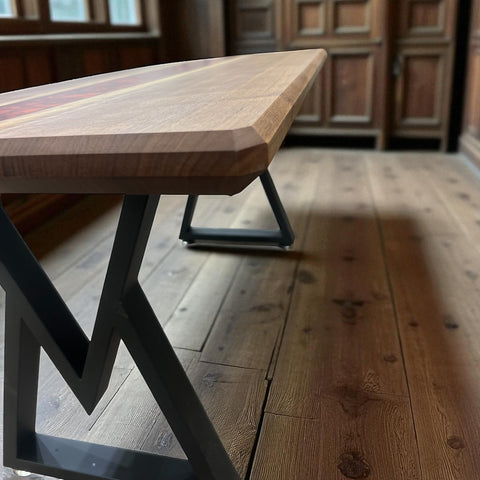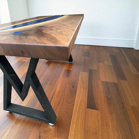Each table is built using premium walnut wood with a flowing epoxy river through the center. Measuring approximately 18” x 36”, it’s the perfect size for a living room centerpiece. The design is completed with modern A-frame legs, providing both stability and style.